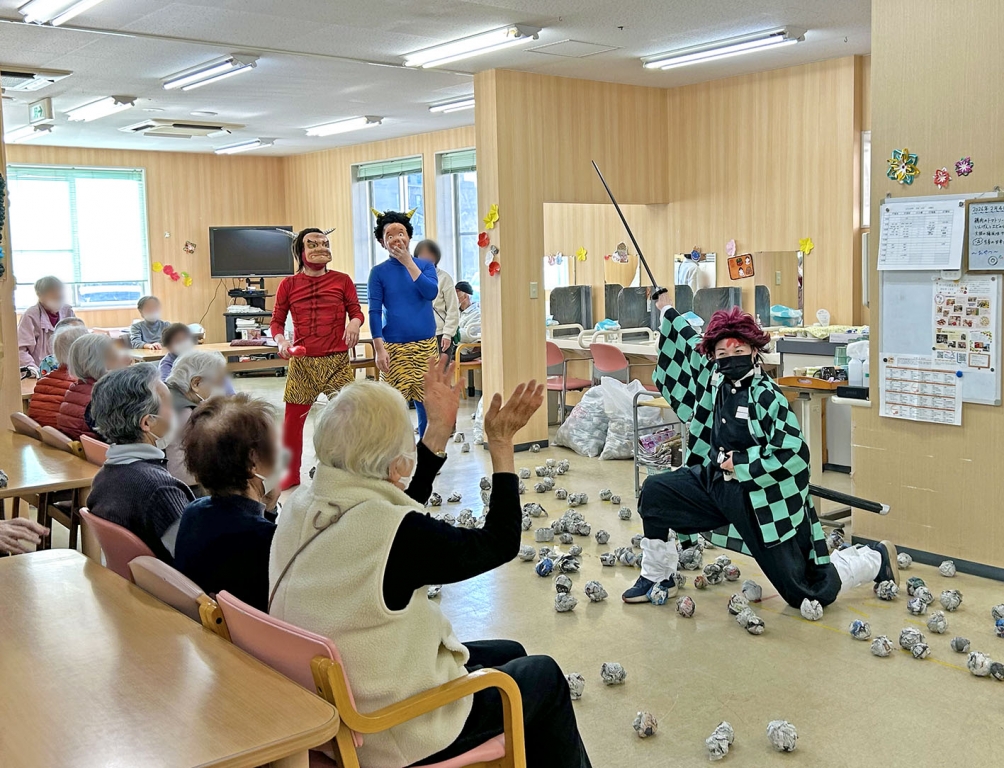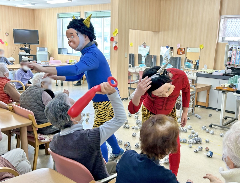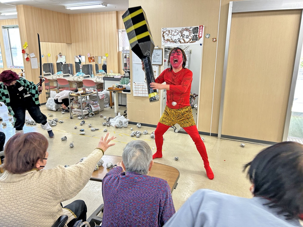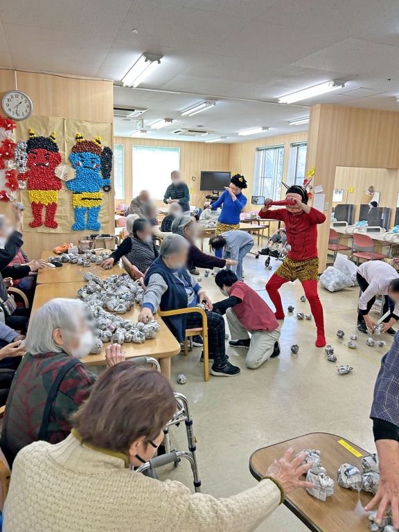 ユニークな鬼漫才も楽しみつつ、皆で玉を投げまくりました!