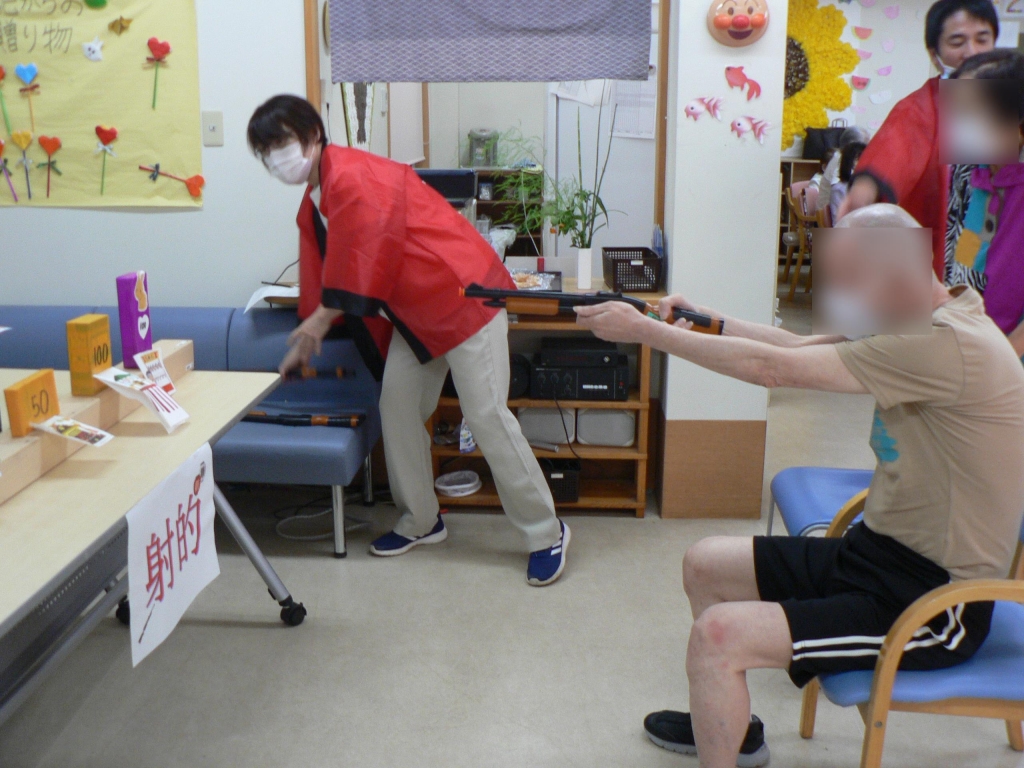 輪投げや射的、ヨーヨー釣りを皆さん順番に回り楽しく一生懸命に行いました!夏祭りの後は特別なおやつの提供も!!普段とは違う内容に笑顔も溢れます!