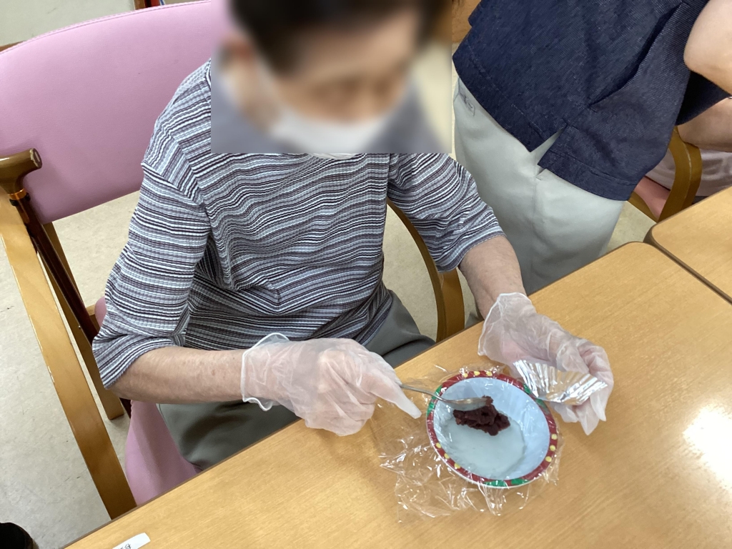 水まんじゅうにあんこを入れて丸めています、「初めて作るわ~」や「出来上がるのが楽しみ」等楽しそうに行ってくれました!